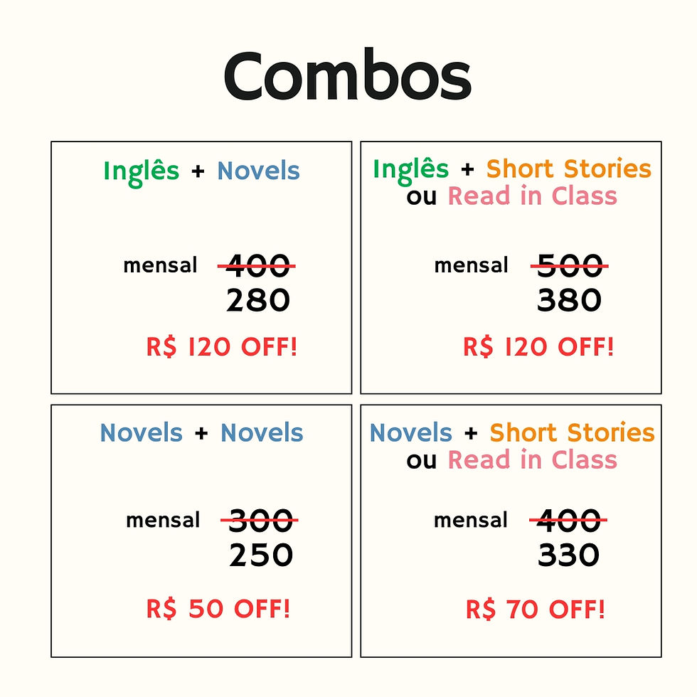 Nossos cursos quinzenais (Novels Intermediate, Advanced ou Big Reads) custam R$150 ao mês, já os cursos semanais (Read in Class, Short Stories ou English classes) custam R$ 250 ao mês. Nós oferecemos descontos de 12% para um pagamento único à vista dos meses de Fevereito até final de Junho.